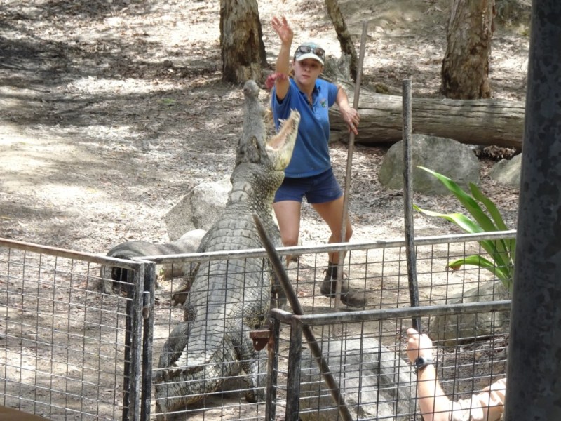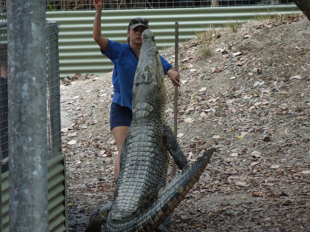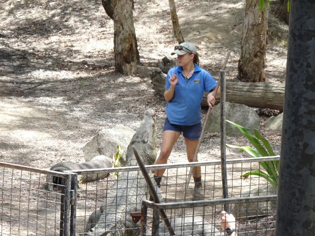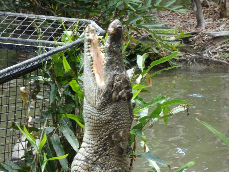 The crocodile feeding show was good to be able to see the crocs up close and to hear the snap of their jaws which is air displacement. The young keepers were very casual walking in amongst the crocs and feeding them by hand. I was nervous just watching them. The female crocs have all been bred in captivity but the male crocs are the problem crocs from elsewhere in far north Queensland. One croc tried to attack a golfer on the green at the Sheraton Mirage in Cairns. That would put you off golf! One had been eating this farmers cows near Innisfail and one had eaten lots of local dogs. So they catch them in a big baited cage and transport them to Hartleys to keep them out of mischief. They have to be careful how many males go into the same lagoon as they can be very aggressive towards each other. Apparently a few months ago there was a feeding show going on and one male crocodile bit another male crocodile’s leg clean off in the middle of the show! Luckily for the crocodile they have this ability to stop blood flow when this happens which stops them bleeding out and dying.