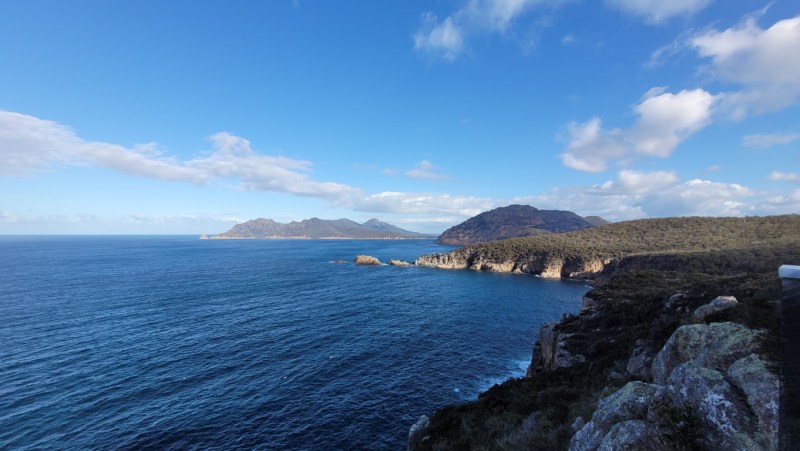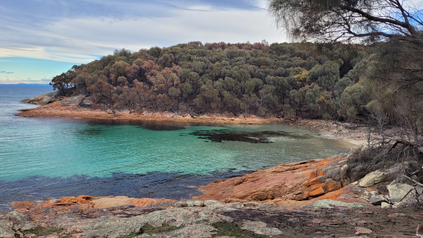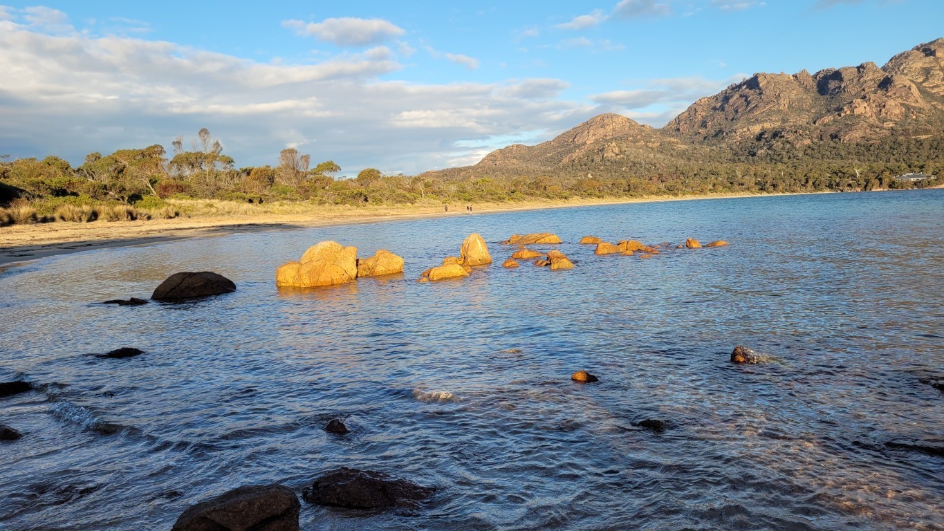 Great national park campsite right on the beach. Walked up to Wineglass Bay lookout. Great views but lots of steps. My legs have only just recovered from the Cape Hauy 4500 steps. You have to hike up through these rocky mountains called ‘The Hazards’ which are spectacular. There are then 1000 steps down to Wineglass Bay beach. Really beautiful walk back along Hazard Beach. I think it’s the orange lichen on the rocks that makes the bays look amazing and the sea is such a lovely aqua colour.