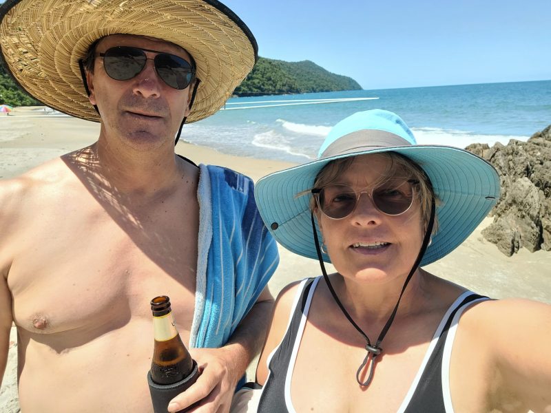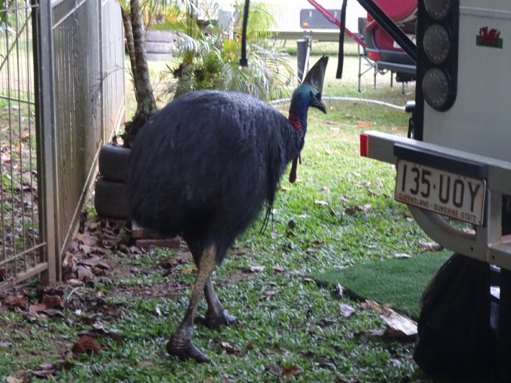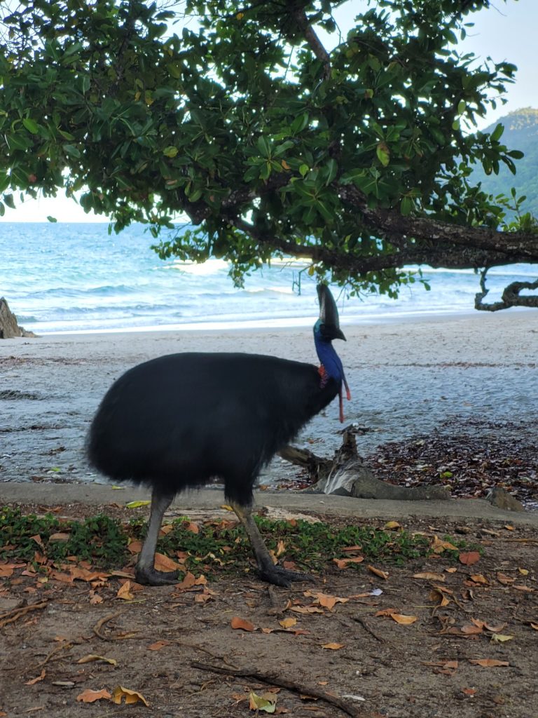 A tiny little bay surrounded by densely forested hills, a very beautiful place. This bay is known for cassowaries and it didn’t disappoint. There was a very cheeky cassowary who went around the campsite trying to steal any food left out. Our neighbour left some bread rolls out in a plastic bag and he wanted them badly. The neighbour managed to get them back so off he went down the beach to hassle anyone who was sitting at a camping table having some food. He came every day he was not shy.