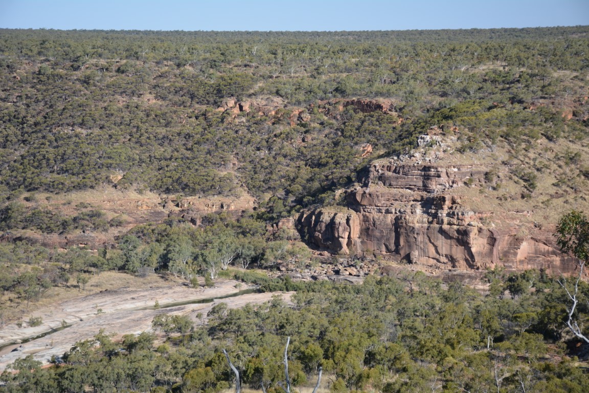 About 74kms north of Hughenden. This is a bush camp with very separate camping areas for each caravan or tent. Very nicely spaced do you have some privacy and bush land between each camp area. I liked that the whole thing was one way and no reversing required as you could just drive through your camp area. I was expecting to be high on a hill but when you get there it all looks really flat until you walk to the lookout and you can see the drop down to the gorge. The walking track is 1.2kms of zig zagging down to the bottom over very uneven rocks took us about 20 mins. There was still some water in the gorge and lots of fish. It was a bit nippy though when I got in for a dip. Nice to cool down after the hike down but I think you need it more after the hike back up. We took a packed lunch and just lazed around reading at the bottom.