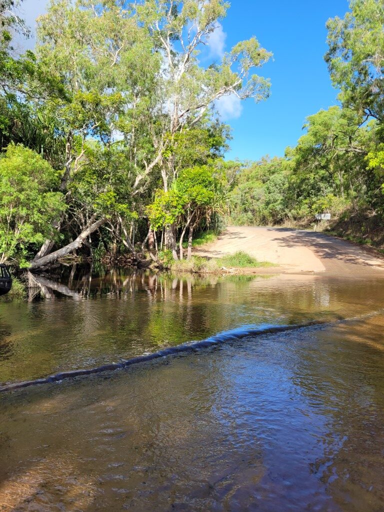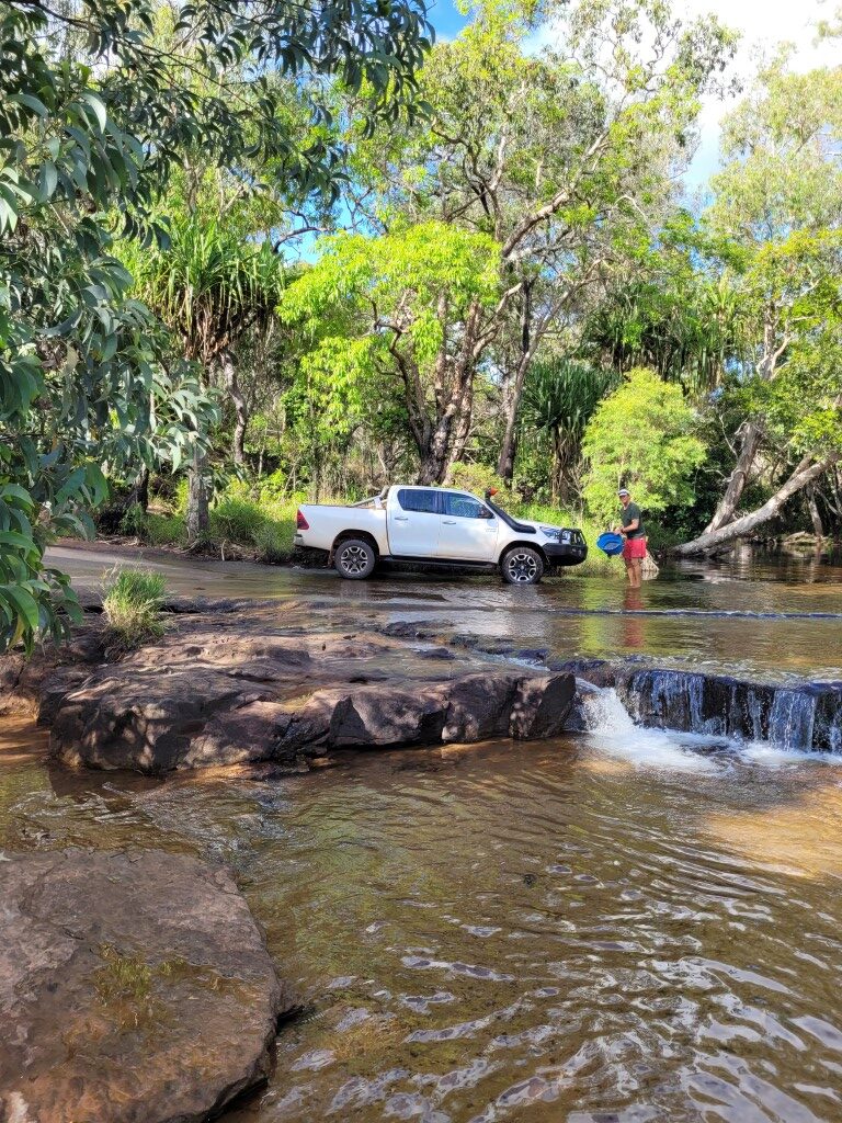 Stopped the night at Archer River as Simon wanted to watch the AFL Grand Final. They had a big screen set up and a few people there for the match. We did 5 hours driving to get there and another 5 to get to Isabella Falls. The road to Jardine was great as the grader had been through but south of the Jardine was horrendous. Much worse than the way up. It was such a relief to get to Isabella Falls. It’s a tiny little site with room for about 5 campers and one caravan. First thing we did was unload the ute tray and drive the ute straight into the ford crossing to wash all the red dust off. Simon washed the ute and I wiped down the contents of the ute tray. Everything was covered in a thick layer of dust. Our camping table is now rust and white the dust is engrained in the plastic. Even our clothes have red stains on them it gets into the fabric and ruins them.