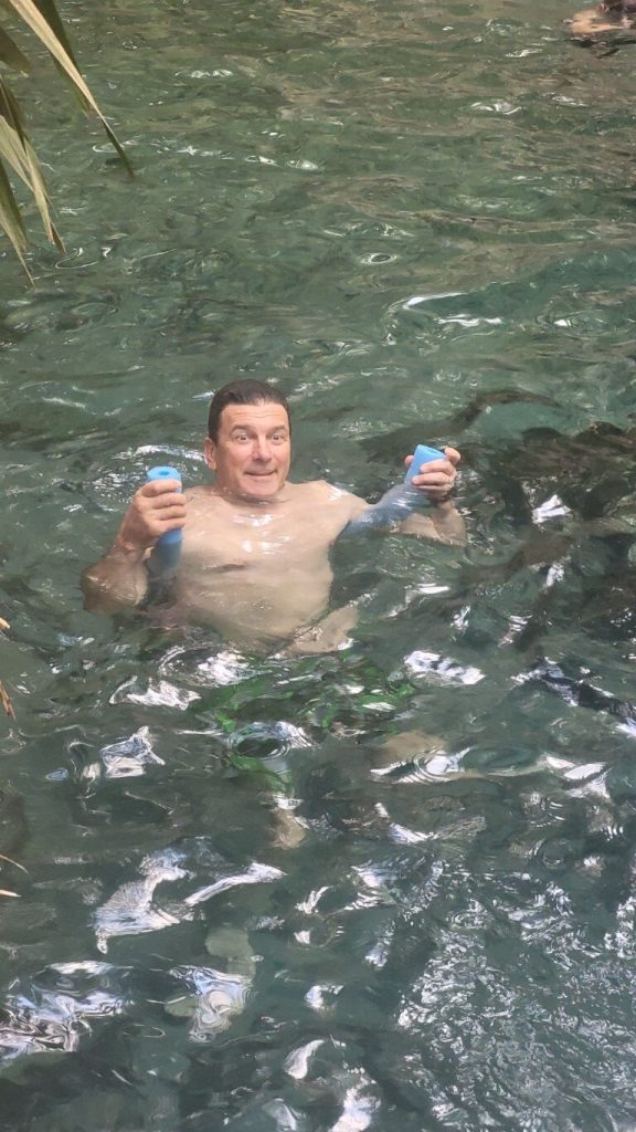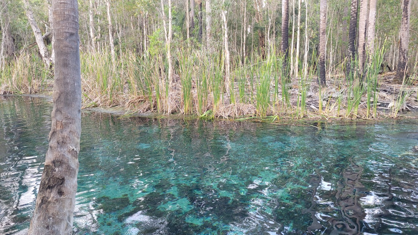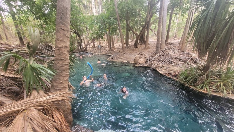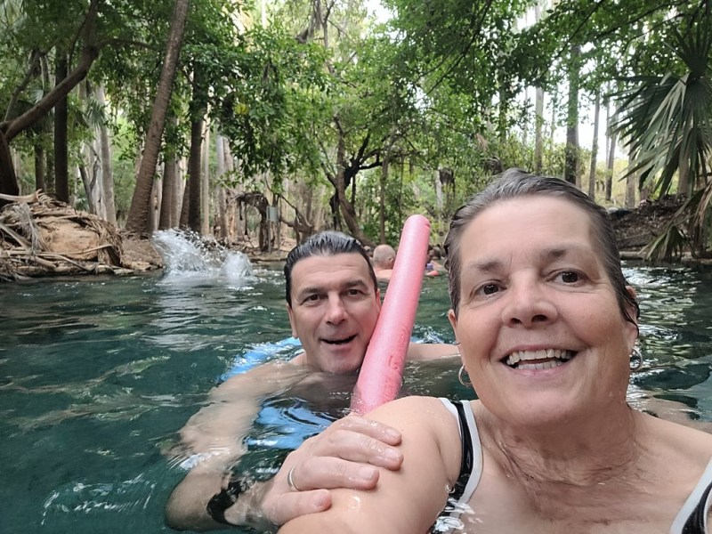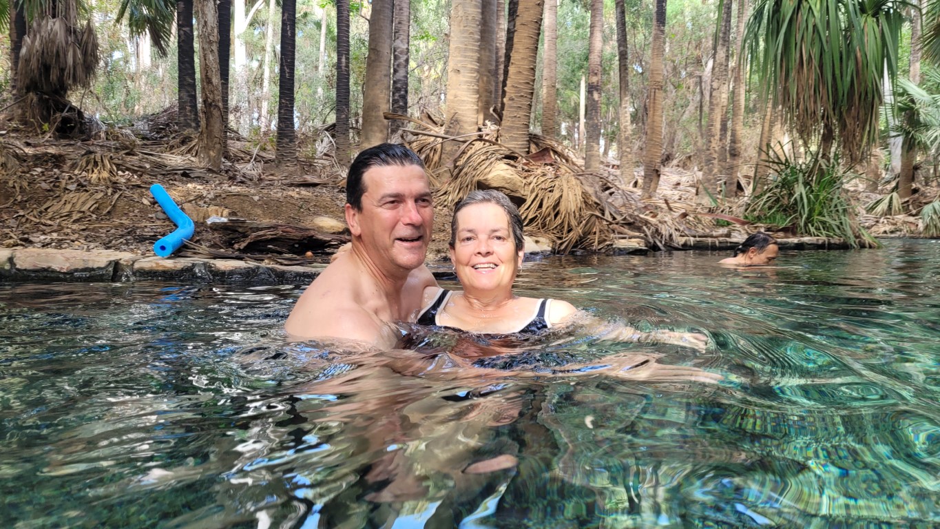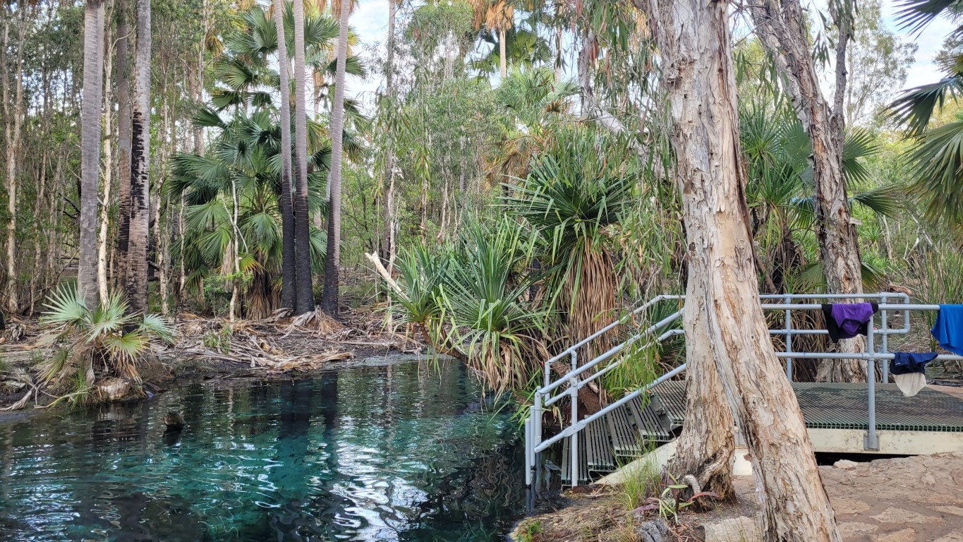 What a great place. There are two hot thermal springs here. One was at the homestead set in amongst the trees but they had built stone walls and steps so more like a long swimming pool with a current running through it. The temperature was around 37C, very relaxing. Bitter Springs was on the other side of the town and this was a much more natural setting for the hot spring. You got in one end with your pool noodle and the current carried you very slowly down stream around the bends and under fallen trees until you could get out about 15 mins later and walk back which took about 3 mins. The water is crystal clear and almost aqua in colour. A very nice experience. They say that freshwater crocodiles can inhabit the area but we didn’t see any.