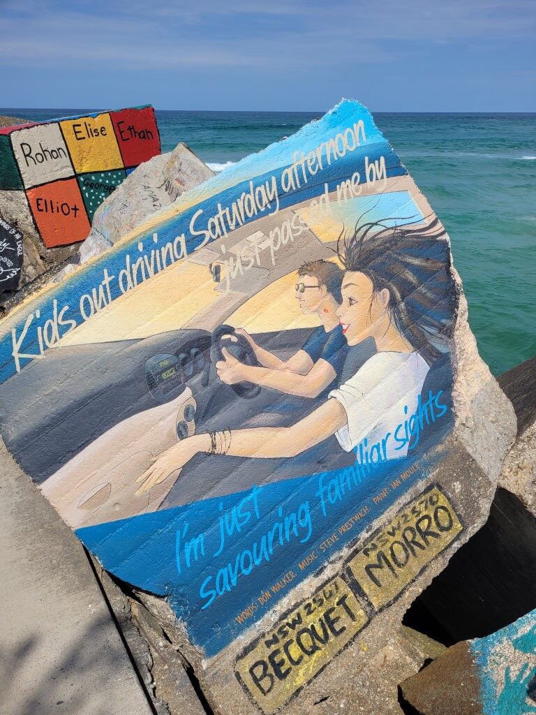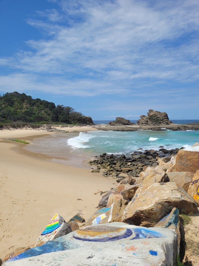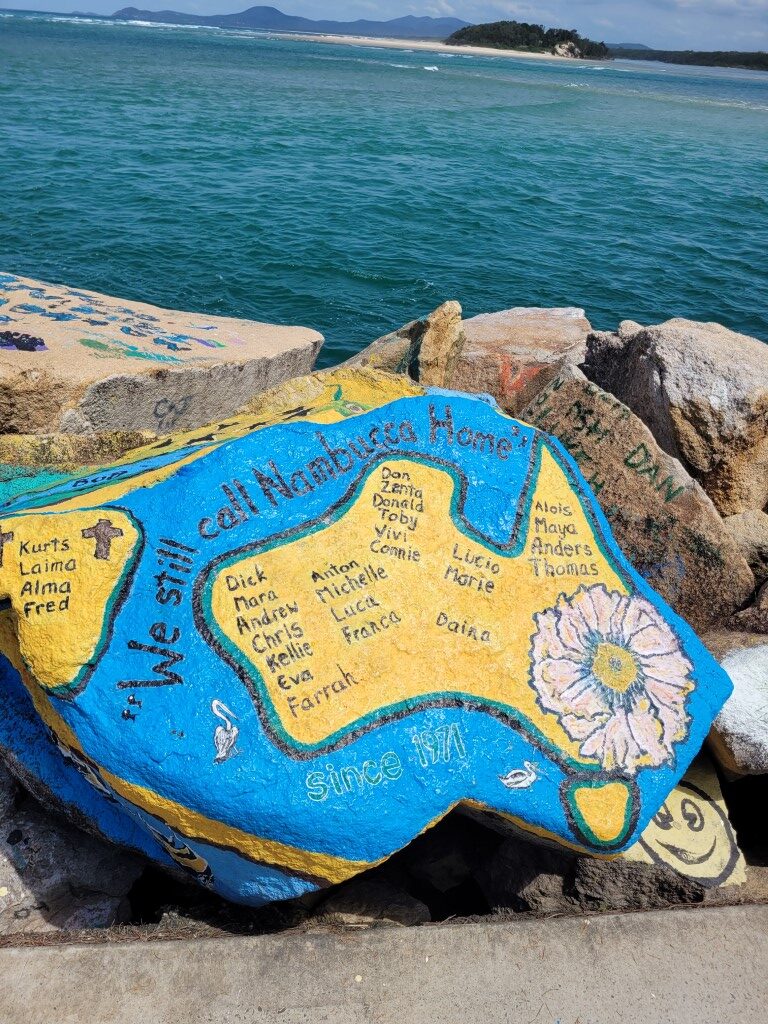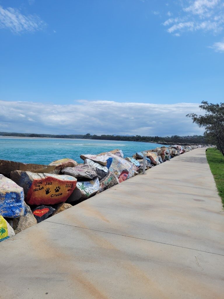 Lots of wildlife here big monitor lizards and kangaroos. Simon did a bit more drone footage. They have a ‘V Wall’ along the pier and anyone can paint a rock with whatever they want. Some of the art work was pretty good. Was tempted but didn’t have any paints! Our favorite beach here was Shelley Beach really lovely and sheltered. I think the average age in Nambucca Heads must be 65+ makes me feel quite young!