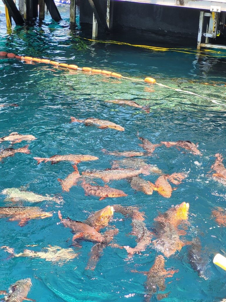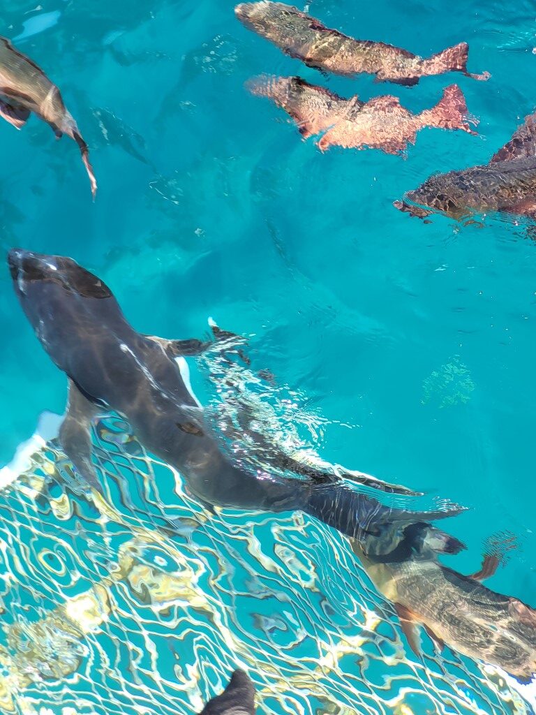 They had a snorkelling area which was roped off into sections with big buoys further out as rest areas. So armed with our flippers, snorkel and masks off we went. Loads of fish cannot remember the names of them all but we saw Seargeant Majors, Parrot fish, Clown Anenomefish (Nemo), Red Bass, Giant Trevally, Yellow Tailed Barracuda. They also do a feeding session off the pontoon at 1pm and the fish knew so they started coming in about 10 mins before hand. The red bass changed colour when feeding they flushed a deep red.