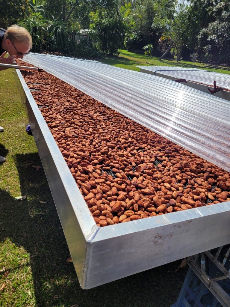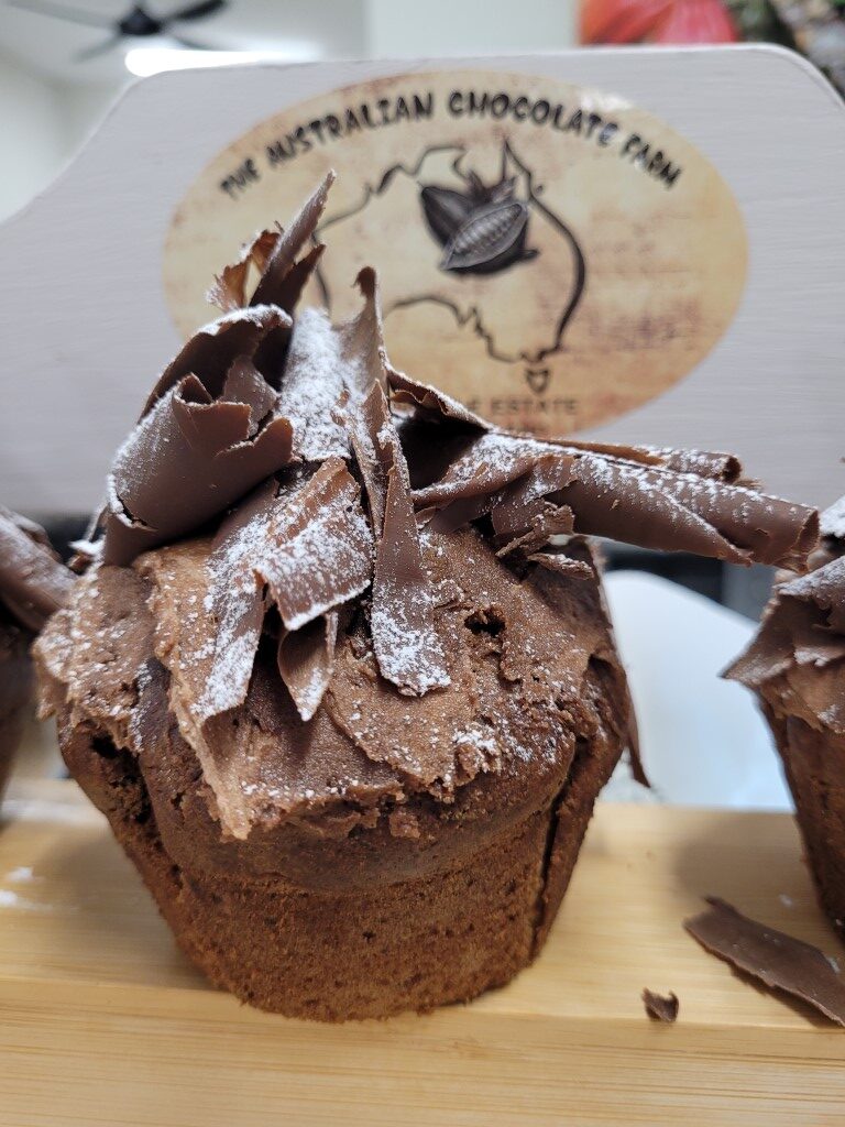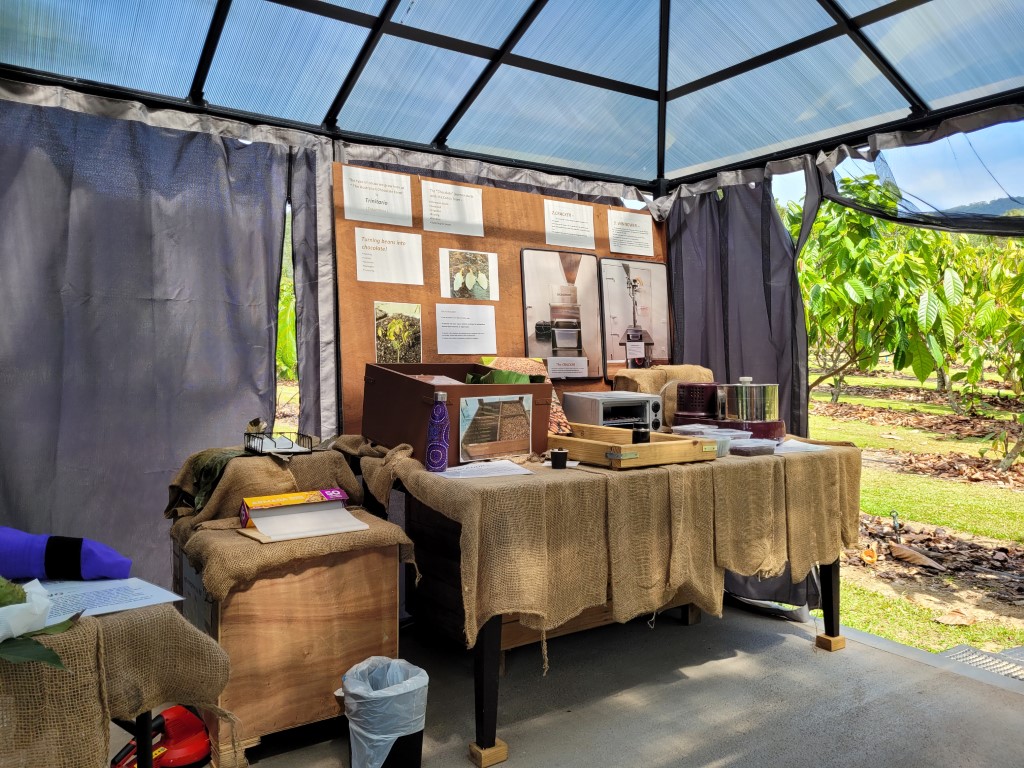 Jenny took us through their history and then we go to walk amongst the trees. I was amazed how tiny the flowers are and that they just pop out on the trunk. The fruit can also pop out anywhere on the trunk or branches. We then went off to a tent where Jenny cut one open and we got to taste the white pulp that covers the bean it was very creamy and tasted of citrus. All the beans are attached to a placenta and when you cut the bean itself open it’s purple. She then took us through the entire process. I won’t go through it all or you will not need to visit. To finish off you get a tasting prepared by Darryl back at the café. A wonderful way to spend a few hours.
