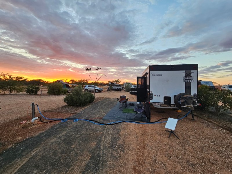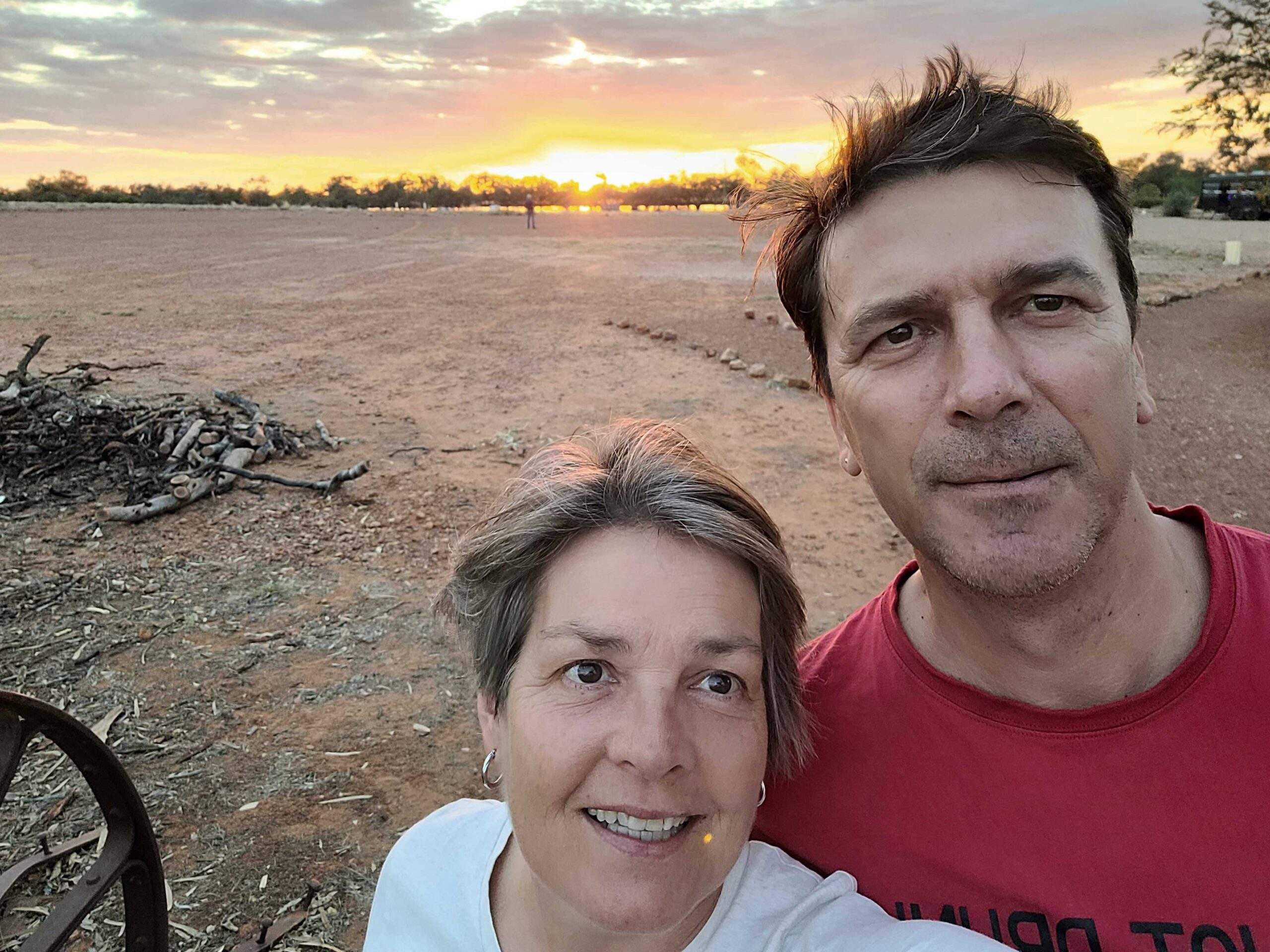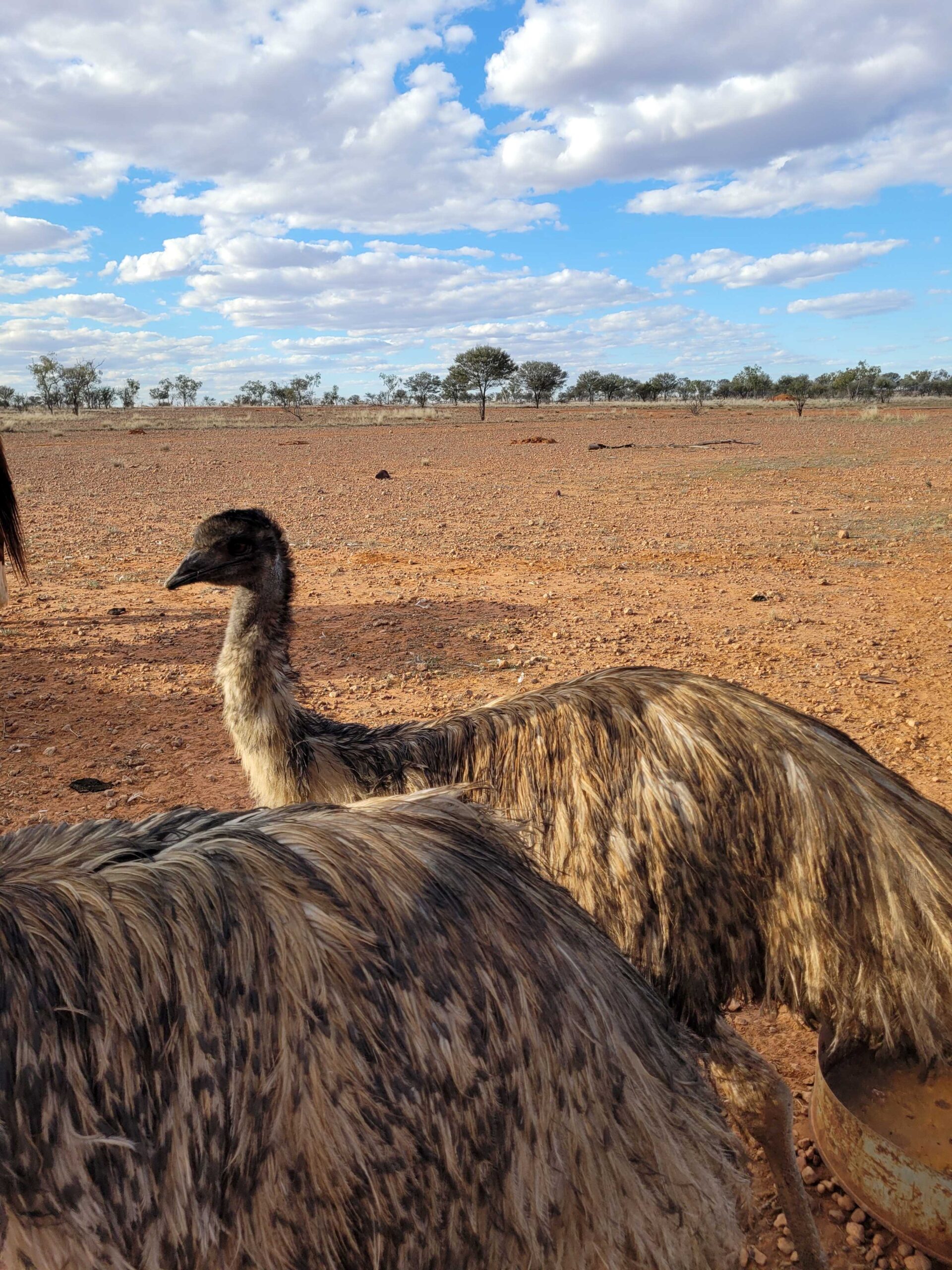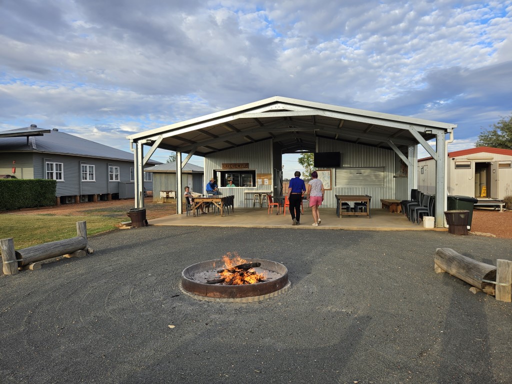 It is on the edge of Lake Houdraman. This campsite set up was excellent. They have each site separated with native trees and a ‘Lakeview pub’ which is what they call their bar. At 5pm they ring the bell to get all the campers up for a drink. There are two resident emus and a joey on the property. Excellent facilities here and you could buy goat curries made from their own goats, Simon tried one which was very good.