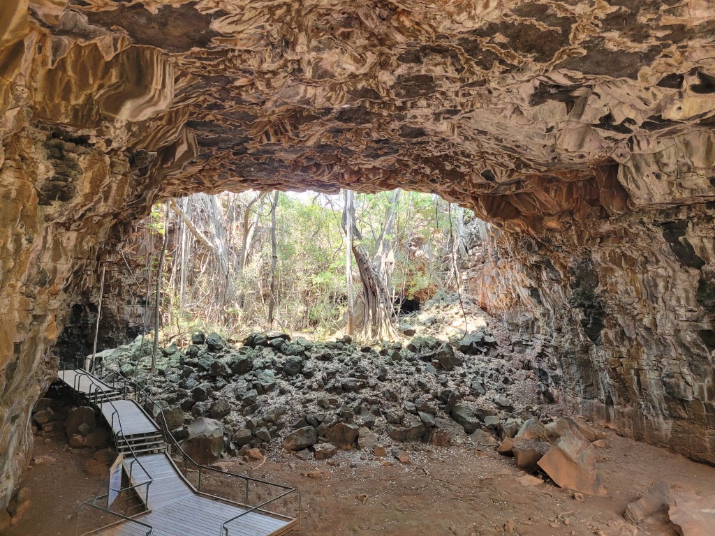 The Undara Volcanic National Park is 275km south west of Cairns. This park has one of the longest flows of lava originating from a single volcano, The ‘Undara’. We booked a tour and they drive you out to the lava tube, there is an amazing arch on the way in where the roof of the tube has collapsed. You get to go into two of the lava tubes and walk along the boardwalks. The Stephenson tube still had some water in it and it was an amazing aqua blue. Apparently scientists who go deeper into the tubes have to wear breathing apparatus as the content of carbon dioxide in the tubes can be as high as 9%.