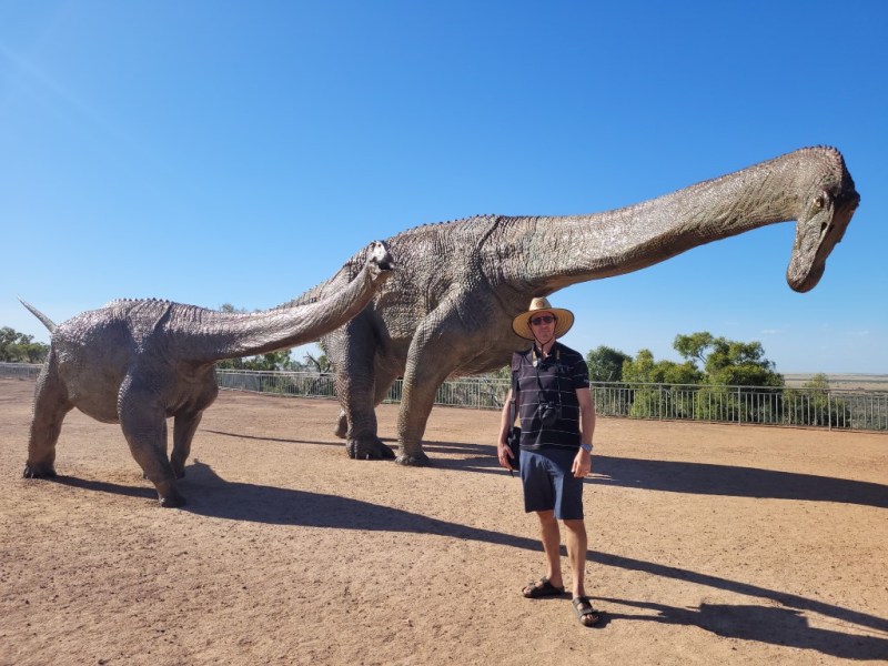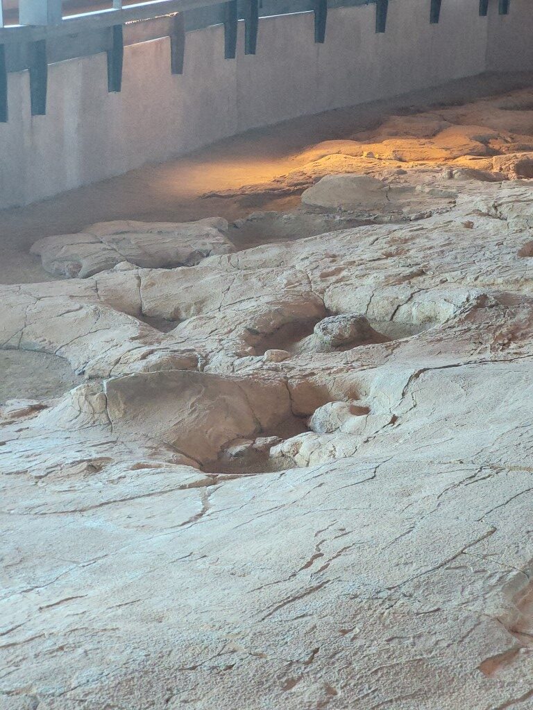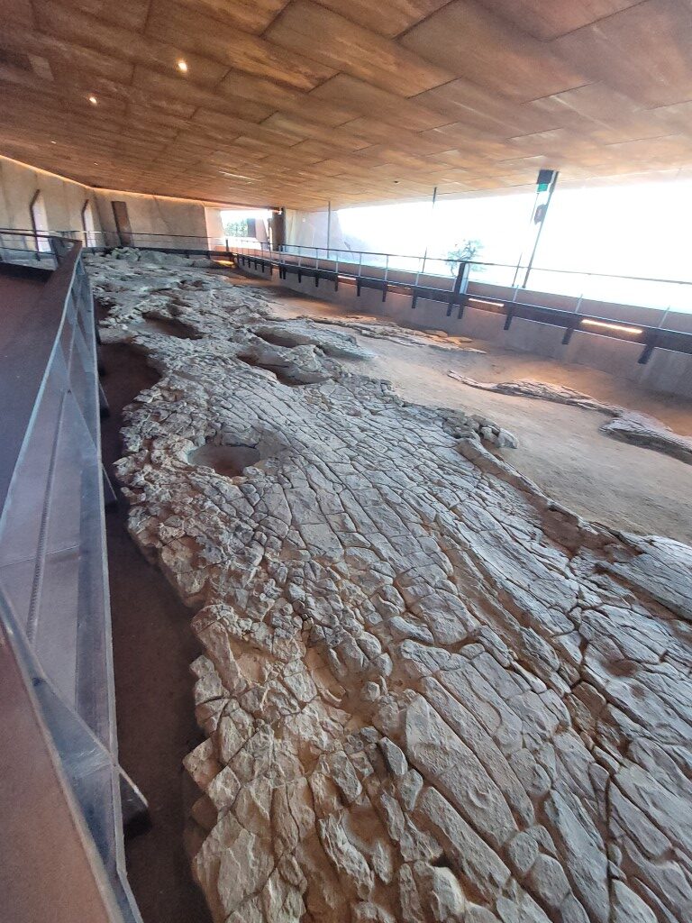 The march of the Titanosaurs are footprints of dinosaurs and a few turtles and crocodiles that were found in Snake Creek on Karoola Station. You can very clearly see the right and left footprints as the Titanosaur walked along. As Snake Creek often floods there was no option to build on the site so they transported the whole thing to this new building. The whole thing is 54 metres long and weighed 300 tonnes. Each piece was numbered and relocated and then put back together again this took from Sep 2018 to November 2020. An amazing achievement.