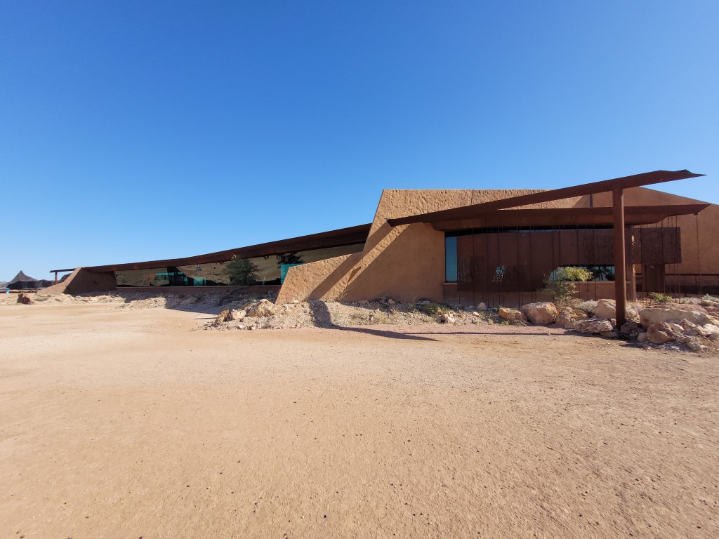 We got picked up by a little golf cart type bus and driven along the Jump Up to the building that housed the exhibition. The building itself was impressive, it blended into the scenery with a low roof and lots of rust coloured iron which matched the colour of the rocks.